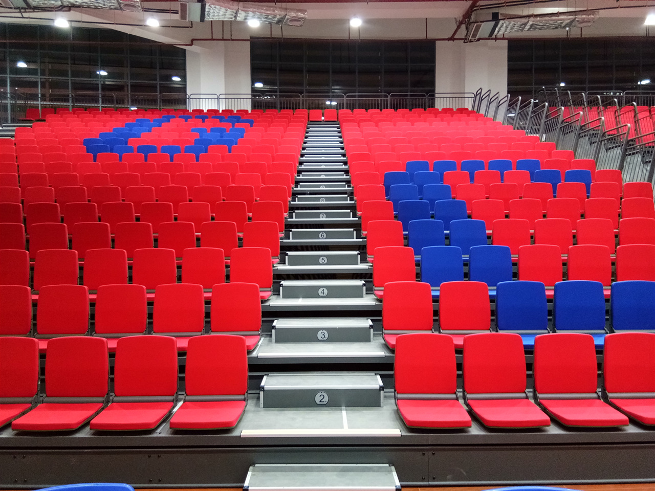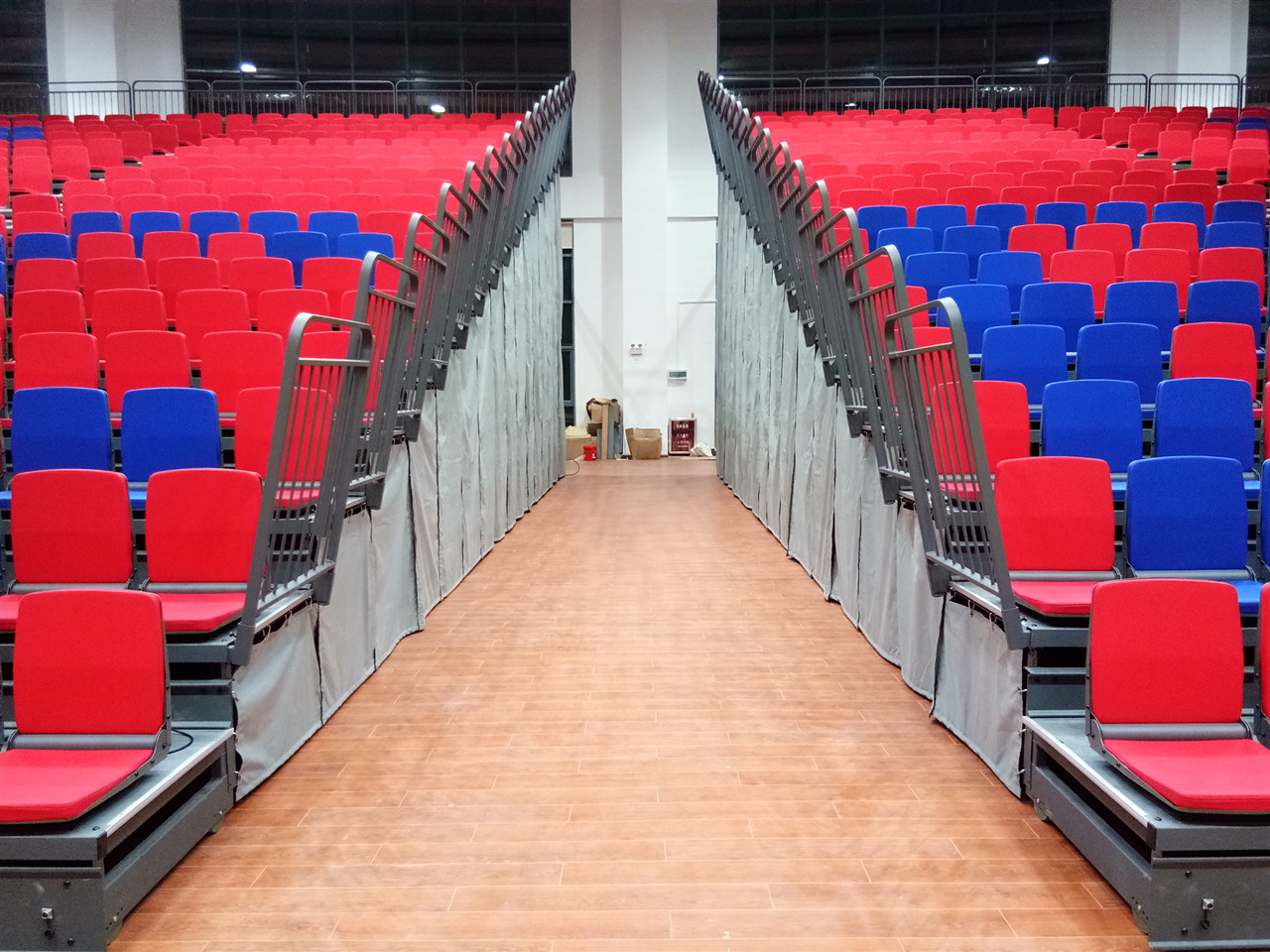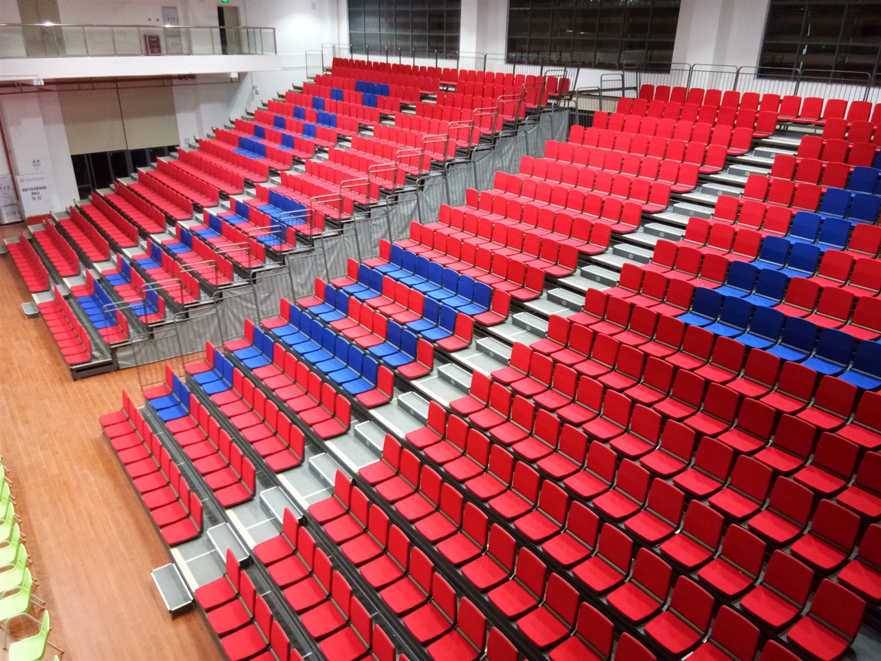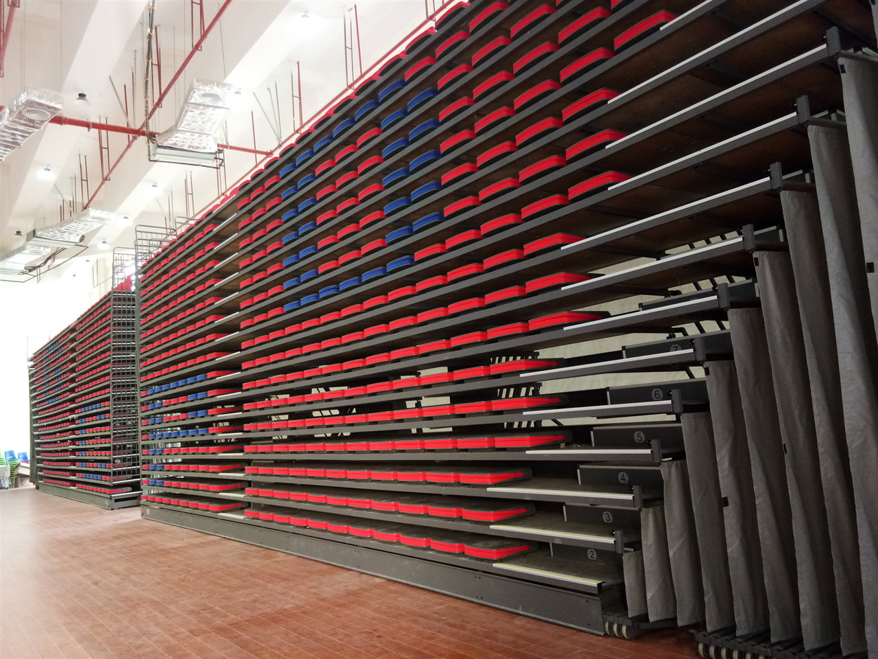 特別設(shè)計的斜支撐系統(tǒng),提供最穩(wěn)定可靠的負(fù)載支撐,最大的下部互聯(lián)導(dǎo)軌,提供強(qiáng)大的支撐,使受力更加均衡,牢固的上部互聯(lián)導(dǎo)軌,保證運(yùn)行的穩(wěn)定,方便牢靠的排鎖設(shè)計可防止系統(tǒng)的意外收攏。所有的支柱均采用支撐螺栓固定,確保穩(wěn)定性。產(chǎn)品材料具有耐腐蝕性能,保障了產(chǎn)品具備超強(qiáng)的使用壽命。看臺系統(tǒng)有多種不同的排距和階高來滿足空間和視線的要求,其伸縮方式為自動,方便使用,感應(yīng)靈敏,貼墻式的收起,讓其使用場地功能上得以最大的發(fā)揮。