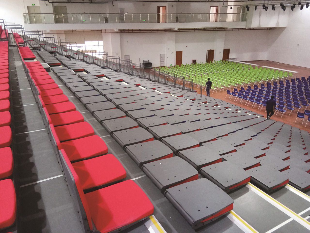 經(jīng)過特殊設(shè)計的座椅能夠直接安裝在每一排踏板之上,伸縮時無需額外存儲座椅。在會議、校園賽事等活動模式時,移動看臺座椅整體伸出,通過場地設(shè)計,最多可以容納千人活動。